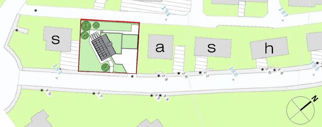 L’area pavimentata esterna è ridotta al minimo utile per consentire uno spazio di manovra per le autovetture, attorno alla casa gira un marciapiede che sul lato ovest crea un’area pavimentata coperta con una struttura ombreggiante a servizio della cucina. Grazie alla struttura compatta generata dall’incastro dei volumi che occupano una modesta porzione del lotto, la superficie filtrante verde (escludendo le coperture piane a giardino) è di oltre 250mq ben al di sopra dei 180mq richiesti.
